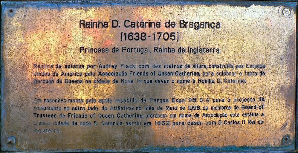 Keywords: Legenda - Catarina de Bragança - Estátua na Parque Expo.jpg 2006-03-13 own assumed Juntas Statue of Catherine of Braganza in Lisbon Metal plaques