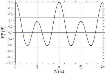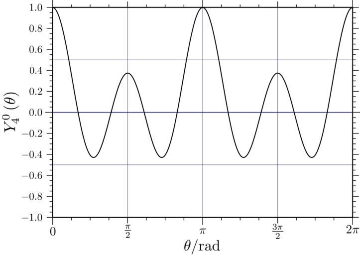 Keywords: Legendre(4,0) Cos(th).svg Legendre Polynomial of cos with l 4 m 0 Own Inkscape 2007-05-24 Legendre Polynomial of cos with l 4 m 0 - Equation <math>Y_4 0 \left \theta \right L_4 0\left \cos \theta \right </math> - Co-ordinate System Cartesian - X Range 0 2 - Y Range -1 1 - 2 - colspan 2 Points of Interest in this Range - Maxima <math>\left 0 1 \right \ </math> <math>\left \pi 1 \right \ </math> <math>\left 2\pi 1 \right \ </math> <br> <math>\left \frac \pi 2 \frac 3 8 \right \ </math> <math>\left \frac 3\pi 2 \frac 3 8 \right \ </math> - Minima <math>\cos \left \theta \right \pm \sqrt \frac 3 7 \ \quad Y_4 0 -\frac 3 7 </math> Spherical harmonics |