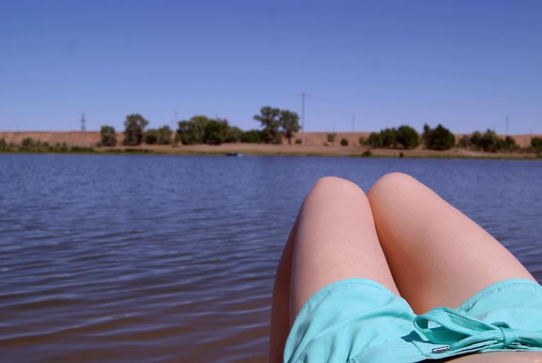 Keywords: legs river summer landscape river bank young woman
