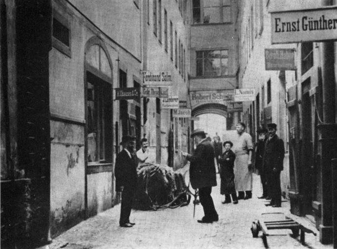 Keywords: Leipzig, Brühl-Hof, Firma Ernst Günther.jpg Innenhof des žSchwarzen Hufeisens Nikolaistraße 55 / Ecke Brühl Veröffentlicht anlässlich des Umzugs der Firma Günther Heinze gegründet 23 Februar 1900 in Leipzig kurz danach trat Ernst Heinze in das Unternehmen ein Frankfurt am Main im Jahr 1968 in neue Räume jetzt Niddastraße 66 anfangs Nr 76 1953 dann Nr 56 Zu erkennen sind die Firmen beginnend links vorn im Uhrzeigersinn A Co Ferdinand Salm J Linderer Pelzwaren M Jacob Robert Schütz Max Altner J Nomis Bernh Haber Rauchwaren Ernst Günther Veröffentlicht an anderer Stelle in Der Rauchwarenmarkt vom 8 Oktober 1931 Die Firma Ernst Günther Heinze die am 1 Oktober ihre Geschäftsräume von Brühl 47 nach Nikolaistraße 33-37 1 Stock verlegt hat besteht am Leipziger Brühl bereits seit über 30 Jahren Rund um den Pelz - Pelz International Oktober 1968 S 96 after 1900 author PD-old Brühl Leipzig Fur wholesale dealers in Leipzig Rund um den Pelz 1968-10 Nikolaistraße 55 Leipzig Fur fashion in 1901 Höfe am Brühl |