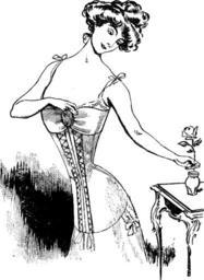 Keywords: LeMYSTEREa hanches fuyantesBREVETE.png fr Hez la Reine du Corset Mne G Guillot Femina; page XIII 1906; 15 Octobre; Anonymous PD Chez la Reine du Corset MME G GUILLOT 10 Rue de la Paix 10 Ses nouveaux Corsets cambres devant de cote et dans le dos son Corset Gaine-Combinaison brevetés déposés sont de haute actualité; ils n'en restent pas moins éminemment hygiéniques Tous ils ont pour effet surprenant et en cela le talent de la créatrice se révèle sous un jour nouveau de procurer un amincissement immédiat qui se traduit au bout de cinq a six mois par une différence de 6 a 8 centimètres a la taille et davantage aux hanches Le MYSTÈRE a hanches fuyantes BREVETÉ Le MYSTÈRE a hanches rondes BREVETÉ Les personnes de santé délicate mais soucieuses d'élégance et désirant s'amincire doivent porter le Mystère a hanches fuyantes ou arrondies La réputation universelle du célèbre corset se maintient en effet inébranlable Prenant chaque saison des lignes nouvelles que la Mode impose il n'en reste pas moins et de plus en plus celui que prônent nos plus grands docteurs N'est-il pas en outre le plus pratique puisqu'il evite le port désagréable et si disgracieux de la ceinture médicale PD-old Line art of women in straight fronted corsets Fashion in 1906 Women's underwear Femina French magazine |