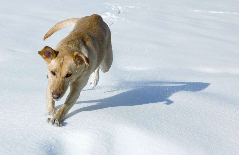 Keywords: Yellow labrador retriever running in the snow. snow yellow labrador running retriever