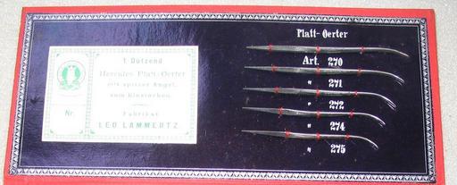 Keywords: Leo Lammertz Aachen, sewing-needles, sample card (2 d).jpg Nähnadel-Musterkarte der Firma Leo Lammertz Aachen 9 x 20 cm Leinen mit Blind- und mit Goldprägung Leo Lammertz Aachen Eingetr Marke Beste Nadel der Welt Neun Musternadeln enthaltend Warenzeichen Eingetr Marke; Nadelheftchen-Etikett 1 Dutzend Hercules Platt-Oerter mit spitzer Angel zum Einstechen Fabrikat Leo Lammertz Platt Oerter Art 270 Art 271 Art 272 Art 274 Art 275 Nadelheftchen-Etikett 1 Dutzend Hercules Quer-Oerter mit spitzer Angel zum Einstechen Fabrikat Leo Lammertz Platt Oerter Art 278 Art 278/279 Art 279/280 Art 280 Own possession Erhalten von der Firma Pelz-Orlob Düsseldorf 2011-05-16 Kürschner <span class signature-talk >talk</span> 11 55 16 May 2011 UTC PD-old PD-textlogo Kürschner <gallery> File Leo_Lammertz_Aachen _sewing-needles _sample_card_ 2_a jpg File Leo_Lammertz_Aachen _sewing-needles _sample_card_ 2_b jpg File Leo_Lammertz_Aachen _sewing-needles _sample_card_ 2_c jpg </gallery> Sewing needles Furrier's collection Kuhn Needlemakers Pelz-Orlob Furriers technology Leo Lammertz |
