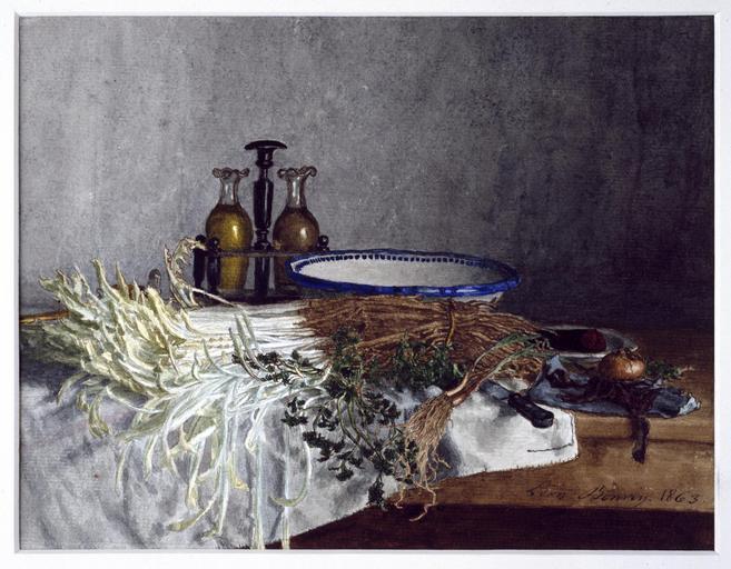 Keywords: Léon Bonvin - Still Life with Cruets and Vegetables - Walters 371646 (2).jpg cm 16 5 21 3 accession number 37 1646 16413 William T Walters Baltimore date and mode of acquisition unknown Henry Walters city Baltimore Walters Art Museum Henry Walters Acquired by William T Walters Signature and date In ink lower right Léon Bonvin 1863; Number In graphite center verso D4 and 3; Number In graphite lower left verso 9; Mark In graphite upper left verso X; Mark In red pencil upper right verso X The Essence of Line A Baltimorean in Paris George A Lucas 1860-1909 The Walters Art Gallery Baltimore 1979 The Drawings and Watercolors of Léon Bonvin The Cleveland Museum of Art Cleveland; The Walters Art Gallery Baltimore 1980-1981 The Realist Tradition French Painting and Drawing 1830-1900 Brooklyn Museum Brooklyn; The Cleveland Museum of Art Cleveland; Saint Louis Art Museum St Louis; Glasgow Art Gallery and Museum Glasgow 1980-1982 place of origin France <gallery> File Léon Bonvin - Still Life with Cruets and Vegetables - Walters 371646 jpg </gallery> Walters Art Museum license 2D The Essence of Line Paintings by Léon Bonvin in the Walters Art Museum Media contributed by the Walters Art Museum needs category review |