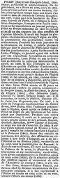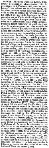 Keywords: Léon Pillet - Grand dictionnaire Universel du XIXe siècle, vol12 p1015 - Internet Archive.jpg Léon Pillet 1803 “1868 French journalist government official and Director of the Paris Opera from Pierre Larousse's Grand dictionnaire universel du XIXe siècle vol 12 p 1015 <br /> Translation of the text <br /> PILLET Raymond-François-Léon man of letters publicist and administrator son of the preceding Fabien Pillet 1772 “1855 born in Paris in 1803 died in 1868 When he finished his studies in law Pillet spent some time studying to become an attorney and in the office of Mauguin In 1827 he took part in the foundation of the Nouveau Journal de Paris where he was in charge of the theatre column When this literary paper transformed itself into a political journal Pillet became editor-in-chief and manager and made it one of the more advanced organs of liberal opinion He was hit with many condemnations when he signed in 1830 the protest of the journalists against the ordinances During the three days of the July Revolution he published the Journal de Paris several times each day in order to spread the proclamations After the accession of Louis-Philippe this journal having been sold by some capitalists favorable to the new government Léon Pillet took over its direction and defended ministerial policies He followed in 1832 the Duke of Orleans to the Siege of Antwerp at the level of Officer of Ordinance and was decorated that same year becoming maître des requêtes in extraordinary service 1834 Royal Commissioner of the Théâtre de l ™Opéra 1838 and was associated in 1840 as director of this theatre with Duponchel who abandoned the administration of the Opéra entirely to him in 1841 Léon Pillet mounted and produced quite a great number of pieces notably Le drapier 1840 La favorite 1840 La reine de Chypre 1841 Don Sébastien 1843 Charles VI 1843 Othello 1844 etc He revived in addition Le philtre Gustave III La Juive Les Huguenots etc In 1847 in the aftermath of the stormy representation of Robert Bruce Mme Stoltz whose influence predominated at the Opera having quit the theatre Léon Pillet resigned his duties at the theatre and was replaced by Duponchel During his active administration he had suffered several lawsuits brought by various artists Duprez Gardoni Baroilhet Mmes Elssler and Dupont and had been far from enriched In 1849 he was named French Consul to Nice then he served the same functions at Cagliari and Palermo 1861 In addition to many newpaper articles some Lettres some Mémoires in response to a mass of attacks one had from him L ™obstiné ou Les Bretons 1837 vaudeville in one act under the pseudonym of Renaud; the Liste de mes maîtresses Un mari du bon temps the Cabaret de la veuve the Mazurka ou Les clarinettes et les marionnettes vaudevilles with various collaborators; the Vendetta opera iin 3 acts 1830 De la situation actuelle de l ™Académie de musique 1844 in 4 volumes etc “ His brother Gustave-Fabien Pillet became Division Chief at the Ministry of Public Instruction He had a drama in five acts and in verse the École des veuves 1826 presented at the Odéon http //www archive org/stream/LarousGrdictionnXIX12bnf page/n1019/mode/1up Internet Archive Pierre Larousse 1817 “1875 author 1874 publication Léon Pillet PD-old-100 |