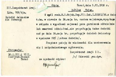 | Keywords: Leonard Skierski - Odpis decyzji o przyznaniu dodatków przez Inspektorat Armii III - 701-001-058-293.jpg Piłsudski Institute document pl Odpis decyzji o przyznaniu dodatków przez Inspektorat Armii III 1926-06-05 pl maszynopis pl Informacja o nieprzyznawaniu dodatku asystencyjnego oddziałom będącym poza garnizonami do 24 maja Po 24 maja przysługuje połowa dodatku ćwiczebnego pl dodatek ćwiczebny; dodatek asystencyjny; przewrót majowy pl Toruń 1926-05-24 <br/> 1926-06-04 701/1/58/293 701 180/2543 2471 Archiwum Józefa Piłsudskiego 1 PD-old-auto-unpublished 1940 yes Collections of Józef Piłsudski Institute of America from 1926 Leonard Skierski Military documents of Second Polish Republic |