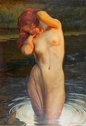 Keywords: Léopold Schmutzler - Froschkönig.jpg Artwork Creator Leopold Schmutzler de Unbekleidetes Mädchen sich in die roten Haare fassend in Wasserkreis vor kleinem auf Seerosenblatt sitzendem Frosch mit Krone Oil on Canvas Size cm 77 109 object history exhibition history credit line place of creation L Schmutzler lower right signature http //livre-d-art ml/post/85457362934/leopold-schmutzler-froschkönig-109-x-77-cm-oil livre-d-art ml https //65 media tumblr com/8c19c2c2d582be7ef58721141ed7c047/tumblr_n5fh8aXbKk1tb9edzo1_1280 jpg direct link https //lot-tissimo com/de/i/5982003/schmutzler-leopold-von-mies-muenchen-1864-1940-froschkoenig-unbekleidetes-maedchen-sich-in-die-roten lot-tissimo com accession number PD-old-auto 1940 Frog Prince Paintings of nude women standing in water outdoors Nude or partially nude women facing left and looking down in art People with water in art Paintings of women with long hair Nude women with red hair in art Transparent clothing in art Water-lilies in art Paintings of lakes Reed beds Leopold Schmutzler |