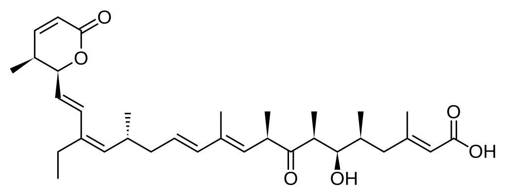Keywords: Leptomycin B.svg Skeletal formula of leptomycin B Created using http //www acdlabs com/download/chemsk html ACD/ChemSketch 10 0 and Inkscape Own 2008-01-22 Fvasconcellos Antifungals Antineoplastic agents Delta-lactones Unsaturated fatty acids |