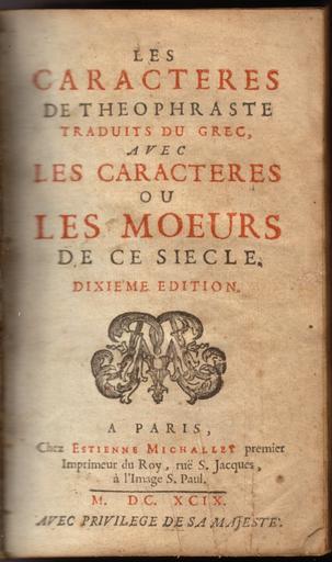 Keywords: Les Caractères 10e ed 1699.jpg fr Page de garde de la 10eme édition des Caractères de Théophraste traduit du Grec avec les Caractères et Mœurs de ce siècle de La Bruyère Michallet Editeur Paris 1699 Own gerardgiraud 2010-08-13 Jean de La Bruyère |