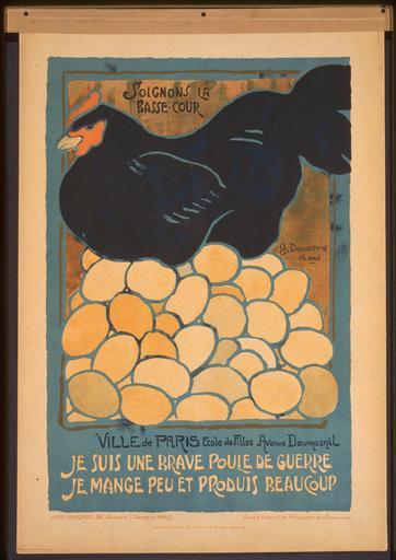 | Keywords: Let's Take Care of the Poultry. I am a Fine War Hen. I Eat Little and Produce a Lot WDL361.png Artwork ru Дуанн Г fr Douanne G en Douanne G zh G· 阿纳 pt Douanne G ar داوان، جي es Douanne G ru Позаботимся о домашней птице Я замечательная военная ку ица Я ем мало а пользы п иношу много fr Soignons la basse-cour Je suis une brave poule de guerre je mange peu et produis beaucoup en Let's Take Care of the Poultry I am a Fine War Hen I Eat Little and Produce a Lot zh 好好照顾家禽 我是 只战时好鸡 我吃得少,产得多 pt Vamos cuidar das aves domésticas Sou uma boa galinha de guerra Como pouco e produzo muito ar دعونا نهتم بالدواجن أنا دجاجة مفيدة إبّان الحرب آكل القليل وأُنتج الكثير ru а этом небольшом плакате выпущенном в 1918 году во Ф анции изоб ажена ку ица сидящая на куче яиц под заголовком Позаботимся о домашней птице и над основной подписью Я замечательная военная ку ица Я ем мало а пользы п иношу много Целью плаката был п изыв к населению Ф анции экономить п одукты и д угие дефицитные това ы подде живая таким об азом военные действия ст аны В отличие от многих д угих плакатов выпускавшихся п офессиональными художниками этот плакат был создан шестнадцатилетним учеником или ученицей подписавшимся как Г Дуанн Данный плакат был частью о ганизованной на заключительном этапе войны п авительственной инициативы по использованию детского тво чества в целях госуда ственной п опаганды Ф анцузский комитет Comité national de prévoyance et d'économies п овел с еди школьников конку с по созданию плакатов и опубликовал многие из лучших абот <br>Цыплята; Яйца; Поставки п одовольствия; Домоводство; Плакаты военного в емени; Пе вая ми овая война 1914-1918 гг fr Cette affichette produite en France en 1918 montre une poule couvant un tas d'œufs sous la légende « Soignons la basse-cour » et au-dessus de la légende principale « Je suis une brave poule de guerre je mange peu et produis beaucoup » L'objectif de l'affiche était d'encourager la population française à préserver les aliments et autres denrées rares afin de soutenir l'effort de guerre Contrairement aux nombreuses affiches conçues par des artistes professionnels cette œuvre fut produite par un élève de 16 ans qui la signa de son nom « G Douanne » L'affiche faisait partie d'une initiative soutenue par le gouvernement et mise au point vers la fin de la guerre consistant à utiliser l'art des enfants pour l'effort de propagande nationale En France le Comité national de prévoyance et d'économies organisa un concours d'affiche ouvert aux écoliers puis il publia plusieurs des meilleures réalisations <br>Poules; Œufs; Approvisionnement alimentaire; Économie domestique; Affiches de guerre; Guerre mondiale 1914-1918 en This small poster produced in France in 1918 features a hen sitting atop a pile of eggs beneath the caption Let's take care of the poultry and above the main caption which reads I am a fine war hen I eat little and produce a lot The aim of the poster was to encourage the French population to conserve food and other scarce goods in order to support the war effort Unlike many posters which were produced by professional artists this work was designed by a 16-year-old student who signed his or her name as G Douanne The poster was part of a government-supported initiative developed late in the war to use children s art in the national propaganda effort The French Comité national de prévoyance et d'économies organized a poster contest for schoolchildren and went on to publish many of the best entries <br>Chickens; Eggs; Food supply; Home economics; War posters; World War 1914-1918 zh 这张小海报于 1918 年制 于法国,图中 只母鸡, 堆鸡蛋上,其上 标题: 好好照顾家禽 ,其下为海报主标题: 我是 只战时好鸡 我吃得少,产得多 此海报旨 鼓励法国人节约食物和其他 缺物资,为战争 利 出贡献 跟许多职业画家制 的海报不 样,这件 品是 名 16 岁的学生设计的,他/她的签名是 G· 阿纳 法国政 支持的行动 战争后 中使用儿童画 全国宣传 这张海报就是这样产生的 法国国家养 金与储蓄委员会 中小学生中举办了海报竞赛,并出版了其中的许多 佳参赛 品 <br>鸡; 鸡蛋; 食品供应; 家庭经济; 战争海报; 第 次世界大战,1914-1918 年 pt Este pequeno cartaz produzido na França em 1918 representa uma galinha sentada sobre uma pilha de ovos entre as legendas Vamos cuidar das aves domésticas e Sou uma boa galinha de guerra Como pouco e produzo muito O objetivo do cartaz era incentivar a população a conservar os alimentos e outros bens escassos a fim de apoiar o esforço de guerra Ao contrário de muitos cartazes que foram produzidos por artistas profissionais este trabalho foi criado por uma estudante de 16 anos que assinou seu nome como G Douanne O cartaz era parte de uma iniciativa apoiada pelo governo desenvolvido no final da guerra para usar a arte infantil no esforço de propaganda nacional O Comité national de prévoyance et d'économies da França organizou 