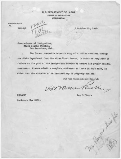 | Keywords: Letter from Commissioner General of Immigration to Commissioner of Immigration, Angel Island Station, regarding enemy... - NARA - 296432.jpg Scope and content This document is from a case concerning German native Ernst Hamann who had the misfortune to arrive in the U S a few days after President Wilson's anti-enemy alien proclamation of April 6 1917 Hamann was interned on Angel Island in San Francisco Bay General notes 296432 Local identifier Department of Justice Immigration and Naturalization Service San Francisco District Office - NARA's Pacific Region San Bruno NRHAS 1000 Commodore Drive San Bruno CA 94066-2350 1917-10-23 Record group Record Group 85 Records of the Immigration and Naturalization Service 1787 - 2004 Record group ARC 414 Case Files of Investigations Not Resulting in Warrant Proceedings in the San Francisco District and Investigations Within the San Francisco District at the Request of Other Service Offices compiled 1912 - 1944 Series ARC 296429 File unit Investigation Case File 12016/01106 -- Enemy Aliens 1916 - 1929 File unit ARC 296430 Variant control numbers NAIL Control Number NRHS-85-INSSF-HAMANN1106-2 Other versions <gallery> File Letter_from_Commissioner_General_of_Immigration_to_Commissioner_of_Immigration _Angel_Island_Station _regarding_enemy _-_NARA_-_296432 tif tif File Letter_from_Commissioner_General_of_Immigration_to_Commissioner_of_Immigration _Angel_Island_Station _regarding_enemy _-_NARA_-_296432 jpg jpg </gallery> NARA-cooperation PD-USGov 1917 Documents related to Angel Island Immigrants to the United States German American history Internment in World War I |