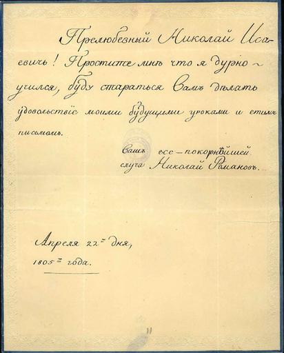| Keywords: Letter from Nicholas Romanov, 1805.jpg ru Письмо великого князя иколая Павловича своему воспитателю И Ахве дову от 22 04 1805 2012-08-25 http //www rusarchives ru/evants/exhibitions/pavel/68 shtml Nicholas I of Russia Nicholas I of Russia PD-Art Uploaded with UploadWizard Nicholas I of Russia's items Signatures of Russian monarchs |