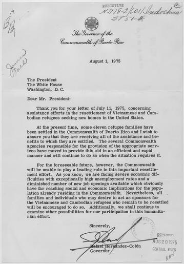 | Keywords: Letter from Rafael Hernandez-Colon, Governor of the Commonwealth of Puerto Rico, to President Gerald R. Ford... - NARA - 186681.tif Scope and content General notes 186681 Local identifier President 1974-1977 Ford White House Office of Central Files 1974 - 1977 Institution Gerald R Ford Presidential Library Gerald R Ford Library NLGRF 1000 Beal Avenue Ann Arbor MI 48109-2114 1975-08-01 Record group Collection GRF-0056 White House Central Files Subject Files Ford Administration 08/09/1974 - 01/20/1977 Record group ARC 1130 White House Central Files Subject Files on National Security and Defense compiled 08/1974 - 01/1977 Series ARC 186672 File unit ND 18-2/CO 1 Refugees/Indochina 08/09/1974 - 01/20/1977 File unit ARC 186678 Variant control numbers NAIL Control Number NLF-0056-00001-04041-C yes Other versions Gerald R Ford Presidential Library and Museum-cooperation PD-USGov Refugees Gerald Ford |