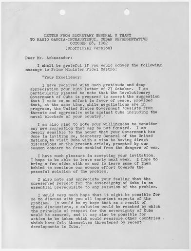 Keywords: Letter From Secretary General U Thant to Mario Garcia-Inchaustegui Cuban Representative - NARA - 193323.tif Scope and content General notes 193323 Local identifier President 1961-1963 Kennedy Office of the Special Assistant to the President for National Security Affairs 01/20/1961 - 11/22/1963 John F Kennedy Library NLJFK Columbia Point Boston MA 02125-3398 1962-10-28 Record group Collection JFK-NSF Papers of President Kennedy National Security Files 01/20/1961 - 11/22/1963 Record group ARC 1164 Papers of President Kennedy National Security Files Countries compiled 01/20/1961 - 11/22/1963 Series ARC 193236 File unit Papers of President Kennedy National Security Files Countries Cuba Subjects Composite of Exchange of Correspondence Between President and Khrushchev U Thant and Castro through 10/28/62 10/16/1962 - 10/28/1962 File unit ARC 193304 Variant control numbers NAIL Control Number NLK-NSF-CNTRYS-KKUTCCORMC-THANTGARCIA yes Other versions NARA-cooperation PD-USGov U Thant |