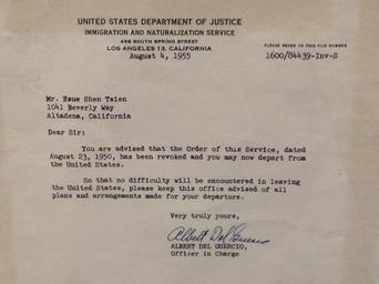 MAKE A MEME View Large Image Letter from US gov to Qian Xuesen, allowing him to leave the US.JPG zh-cn 1955年8 4日,美国移民及归化 致信钱学森,取消对他的禁令,允许其离 美国 图为上海交 大学钱学森图书馆藏信件原件 ...
