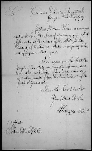 Keywords: Letter of T. Lauson, President of the Council Chamber, transmitting a list of the votes for President by the electors of - NARA - 306214.tif Local identifier U S Senate 03/04/1789 - Center for Legislative Archives NWL National Archives Building Room 8E 7th and Pennsylvania Avenue NW Washington DC 20408 1789-02-08 Record group Record Group 46 Records of the U S Senate 1789 - 2011 Record group ARC 375 Credentials compiled 1789 - 1998 Series ARC 306203 Variant control numbers NAIL Control Number NWL-46-ELECTION-1AH1-9 General notes Scope and content File unit File unit ARC yes <gallery> File Letter of T Lauson President of the Council Chamber transmitting a list of the votes for President by the electors of - NARA - 306214 tif TIFF File Letter of T Lauson President of the Council Chamber transmitting a list of the votes for President by the electors of - NARA - 306214 jpg JPEG </gallery> NARA-cooperation PD-USGov derivative works Hugh Lawson signature jpg James Meriwether signature jpg 1789 documents Documents in English Documents of the United States Manuscripts NARA TIF images with categorized JPGs |