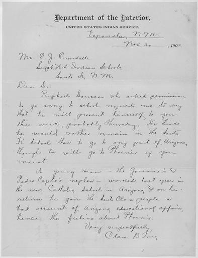 | Keywords: Letter to Superintendent concerning Raphael Sousea's attending the Santa Fe Indian School. - NARA - 293247.tif Scope and content Letter to Supt Crandall from Miss True stating the Raphael Sousea would like to request permission to attend the Santa Fe Indian School rather than a school in Phoenix Arizona Another Santa Clara Pueblo Indian attended the Phoenix school and gave a very bad account of it General notes 293247 Local identifier Department of the Interior Bureau of Indian Affairs Santa Fe Indian School Santa Clara Day School - NARA-Author True Clara D Author 8467825 <br /> New Mexico United States North and Central America state 4191641 35 -105 <br /> NARA's Rocky Mountain Region Denver NRGA Building 48 Denver Federal Center West 6th Avenue and Kipling Street Denver CO 80225-0307 1903-11-30 Record group Record Group 75 Records of the Bureau of Indian Affairs 1793 - 1999 Record group ARC 404 Letters Received from Day School Teacher Clara D True compiled 08/29/1902 - 09/17/1906 Series ARC 293139 File unit File unit ARC Variant control numbers NAIL Control Number NRG-75-E38-C19031130C yes Other versions NARA-cooperation PD-USGov Native American schools ~ 1903 in New Mexico NARA images of New Mexico ~ |
