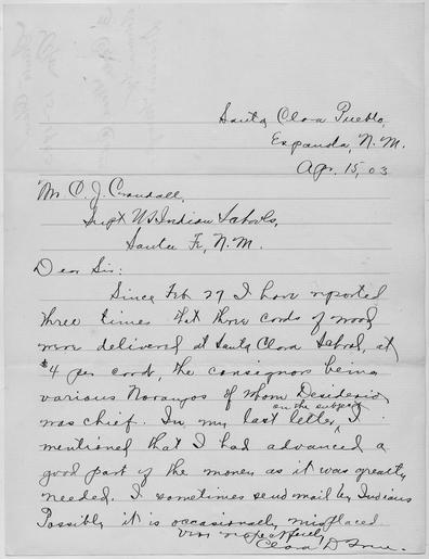 Keywords: Letter to Superintendent requesting reimbursement for 3 cords of wood. - NARA - 293196.tif Scope and content Letter to Supt Crandall requesting reimbursement for 3 cords of wood that she paid for out of her funds because the Indians needed the money General notes 293196 Local identifier Department of the Interior Bureau of Indian Affairs Santa Fe Indian School Santa Clara Day School - NARA-Author True Clara D Author 8467825 <br /> New Mexico United States North and Central America state 4191641 35 -105 <br /> NARA's Rocky Mountain Region Denver NRGA Building 48 Denver Federal Center West 6th Avenue and Kipling Street Denver CO 80225-0307 1903-04-15 Record group Record Group 75 Records of the Bureau of Indian Affairs 1793 - 1999 Record group ARC 404 Letters Received from Day School Teacher Clara D True compiled 08/29/1902 - 09/17/1906 Series ARC 293139 File unit File unit ARC Variant control numbers NAIL Control Number NRG-75-E38-B19030415 yes Other versions NARA-cooperation PD-USGov United States Department of the Interior |