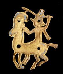 | Keywords: Levantine - Pendant Frame of Goddess on Horseback - Walters 571593.jpg Only the base plate and frame of this pendant survive Traces of white and light-blue inlays provide clues to its original appearance The figure represents the Near Eastern goddess of war and love known as Ishtar in Mesopotamia and Astarte in Syria and Egypt The goddess wears an Egyptian crown and brandishes a spear above her head She appears on a horse which had only recently begun to be used in warfare century 15 13 BC beaten sheet gold traces of glass paste cm 4 5 3 7 0 5 accession number 57 1593 13913 Henry Walters city Baltimore Walters Art Museum Henry Walters Acquired by Henry Walters 1929 Jewelry - Ancient to Modern The Walters Art Gallery Baltimore 1979-1980 place of origin Mediterranean Walters Art Museum license Ancient Near East art in the Walters Art Museum Jewellery in the Walters Art Museum Ishtar Ancient Levant art Horses in art of the ancient Near East |
