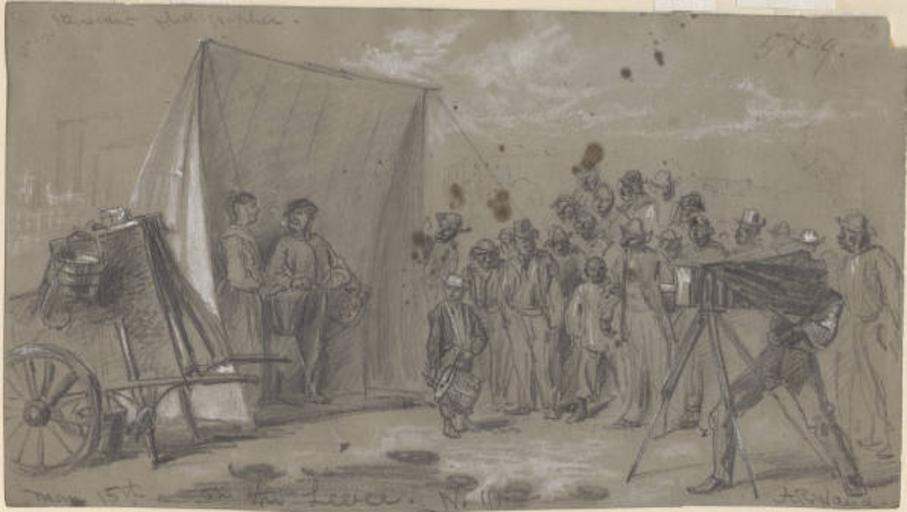 Keywords: LeveePhotographerNewOrleans1871Waud.jpeg New Orleans 1871 Itinerant photographer on the levee sketch by A R Waud Couple pose in front of backdrop for photographer with camera on tripod as a small group of people look on to the side 1871 sketch by A R Waud pencil and Chinese white on grey paper Via http //louisdl louislibraries org/cdm4/item_viewer php CISOROOT /AWW CISOPTR 865 CISOBOX 1 REC 1 1871-05-15 Alfred Rudolph Waud 1828 - 1891 PD-Art 1871 in New Orleans 1871 drawings Fashion in 1871 Alfred Waud People with cameras on tripods New Orleans in art Photographers in art |