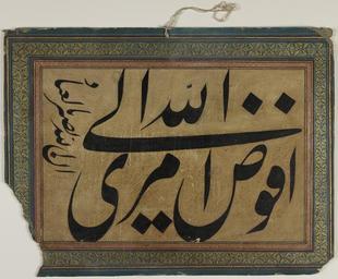 | Keywords: Levha, or Calligraphic Panel WDL6834.png Artwork ru Левха или Каллиг афическая панель fr Levha ou panneau de calligraphie en Levha or Calligraphic Panel zh 书法字幅 pt Levha ou painel de caligrafia ar لوحة ru Данная каллиг афическая панель соде жит высказывание на а абском языке написанное в стиле насталик че ными че нилами на ко ичневом фоне ук ашенном амкой синего и озового цветов с золотым о наментом ижние углы панели с обеих сто он ут ачены В тексте гово ится Я вве яю свои дела Аллаху Воистину Аллах заботится о своих слугах Эта молитва возлагающая всю надежду на Аллаха обычно читается ве ующими в качестве <em> дуа </em> благочестивой мольбы к Господу П едставители яда мистических г упп таких как суфийский о ден акшбанди также многок атно читают эту дуа во в емя молитвы салат аль-фадж п ед ассветная молитва Судя по остаткам ве евки п ик епленной к ве хней части данной панели она могла висеть на стене в жилище де виша п иблизительно в XVIII XIX веках <br>А абская каллиг афия; А абские укописи; Иллюмини ование укописей; Исламская каллиг афия; Исламские укописи; Письмо насталик fr Ce panneau de calligraphie comprend un dicton arabe en écriture nastaliq noire sur fond marron Il est encadré de bordures bleues et roses décorées de motifs dorés Les coins inférieurs droit et gauche ont été perdus Le dicton indique « Je confie mes affaires à Dieu Vraiment Dieu s'occupe de ses serviteurs » Cette prière particulière qui place une confiance totale en Dieu est généralement récitée par une personne comme une <em>doua</em> invocation pieuse au Seigneur Plusieurs groupes mystiques tels que la confrérie soufie des naqshbandiyya récitent aussi cette doua de façon répétée durant la salat al-fajr prière de l'aube à en juger par les ficelles restées attachées à la partie supérieure de ce panneau de calligraphie il a probablement été suspendu à un mur dans une hutte de derviche durant les XVIII<sup>e</sup>-XIX<sup>e</sup> siècles <br>Calligraphie arabe; Manuscrits arabes; Enluminures; Calligraphie islamique; Manuscrits islamiques; Écriture nastaliq en This calligraphic panel includes an Arabic saying written in black Nasta'liq script on a brown background framed in blue and pink borders decorated with gold designs The lower right and left corners of the panel are lost The saying reads I entrust my affairs to God Truly God looks after His servants This particular prayer which places complete trust in God typically is recited by an individual as a <em>du'a</em> pious invocation to the Lord Several mystical groups such as the Naqshbandi order of Sufis also recite this du'a in a repeated fashion during the Salat al-fajr prayer performed at daybreak Judging from the remaining strings attached at the top of this calligraphic panel it probably had been suspended from a wall in a dervish lodge sometime during the 18th 19th centuries <br>Arabic calligraphy; Arabic manuscripts; Illuminations; Islamic calligraphy; Islamic manuscripts; Nasta'liq script zh 此书法字幅上 以黑色波斯体 褐色背景上书写的阿拉伯祈祷词,背景上裱 以金色图案装饰的 色和粉红色边框 字幅的右下角和左下角都遗失了 祈祷词写道: 我把我的事情委托 主, 主确是照顾众仆的 这种特殊的祈祷词,给予 主完全的信任, 常是由个人背诵 为献给 主的<em>虔诚祷告</em> 几个神秘的群体,如苏菲派的纳格 班底教团, 晨礼(黎明时进行的祈祷)时也会以重复的方式吟诵这 虔诚祷告 从此书法字幅顶部的遗留绳串 ,它可能 18-19 世纪的某个时间曾被悬挂 苦行僧寄宿 的墙上 <br>阿拉伯文书法; 阿拉伯语手稿; 插图; 伊斯兰书法; 伊斯兰手稿; 波斯体书法 pt Este painel de caligrafia inclui um ditado árabe escrito em caligrafia nasta'liq preta em um plano de fundo marrom emoldurado por bordas de cor azul e rosa e decorado com desenhos dourados Os cantos inferior direito e esquerdo do painel foram perdidos O texto diz Eu confio meus assuntos a Deus Em verdade Deus olha por Seus servos Esta prece em particular por meio da qual se oferece total confiança a Deus é normalmente recitada por um indivíduo como uma <em>du'a</em> invocação devota ao Senhor Vários grupos místicos como a Ordem Sufi Naqshbandi também recitam esta du'a repetidamente durante o Salat al-fajr oração da alvorada A julgar pelos cordões que permanecem no topo deste painel caligráfico ele provavelmente ficava suspenso em uma parede em um alojamento dervixe em algum momento do século XVIII ou XIX <br>Caligrafia árabe; Manuscritos árabes; Iluminuras; Caligrafia islâmica; Manuscritos islâmicos; Escrita nasta'liq ar تشتمل هذه اللوحة الخطية على مقولة عربية مكتوبة بخط النستعليق الأسود على قطعة ورق بنية اللون، تحيط بها أُطُر باللونين الأزرق والوردي مُزيَّنة بتصاميم ذهبية الركنان الأيمن والأيسر الأسفلان للوحة مفقودان تنص المقولة على الآتي أفوض أمري إلى الله إن الله بصير بالعباد عادةً ما يَقرأ الفرد هذا الدعاء، الذ