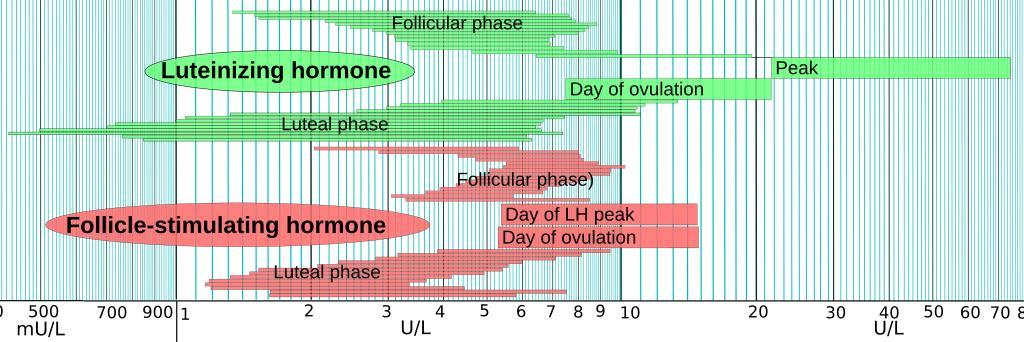 Keywords: LH and FSH in menstrual cycle.svg Reference ranges for luteinizing hormone and follicle-stimulating hormone throughout the menstrual cycle Detail from picture in en Reference ranges for blood tests The y-axis represent time throughout the menstrual cycle with one block corresponding to one day However progesterone and estrogen currently follow different y-axes Reference Values taken from day 1 after LH surge in http //www ncbi nlm nih gov/pubmed/16776638 Establishment of detailed reference values for luteinizing hormone follicle stimulating hormone estradiol and progesterone during different phases of the menstrual cycle on the Abbott ARCHITECT analyzer Reto Stricker Raphael Eberhart Marie-Christine Chevailler Frank A Quinn Paul Bischof and Rene´ Stricker Clin Chem Lab Med 2006;44 7 883 “887 PMID 16776638 Alternative link http //www dianalabs ch/documents/ajouts/Hormones pdf Own Mikael Häggström 2009-11-06 See also thumb left Estradiol and progesterone in menstrual cycle Blood values Follicle-stimulating hormone |