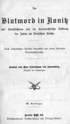 Keywords: Liebermann- Blutmord Konitz- 02-Titel.png Liebermann- Blutmord Konitz- 01-Lageplan Konitz png Liebermann- Blutmord Konitz- 03 png Eine Seite des Buches žDer Blutmord in Konitz A page of the book Der Blutmord in Konitz Buch Der Blutmord in Konitz Mit Streiflichtern auf die staatsrechtliche Stellung der Juden im Deutschen Reich Berlin 1901 <br />Scan des Originals aus der Stadtbücherei Elberfeld durch Wagusi Max Liebermann von Sonnenberg 1848 “1911 et al Original 1901<br />Scan 2008-12-16 PD-old Der Blutmord in Konitz |