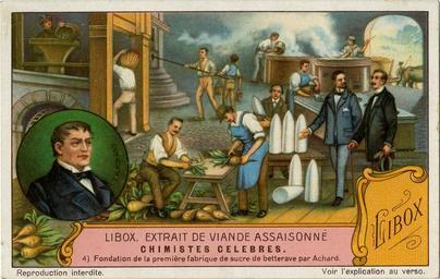 Keywords: Liebig Company Trading Card Ad 01.12.005 front.tif Frédéric-Charles Achard Main image depicts the multiple steps in a manufacturing process going from bottom left to bottom right to top left; there is a circular inset of Archer on the left side Extensive text on verso Front LIBOX EXTRAIT DE VIANDE ASSAISONNÉ / CHIMISTES CELEBRES / 4 Fondation de la première fabrique de sucre de betterave par Achard / Reproduction interdite / Voir l'explication au verso LIBOX SEASONED BEEF EXTRACT FAMOUS CHEMISTS 4 Establishment of the first beet sugar factory by Achard Reproduction prohibited See explanation on reverse Verso Chez nous chaque diner est un festin / depuis que nous cuisinons avec Libox l'Extrait de Viande assai- / sonné de la Cie Liebig Il donne une saveur exquise à tous les mets / et répand une odeur appétissante Une petit dose suffit pour / rehausser le gout de chaque plat Il y a une difference surprenante / entre les mets prepares avec Libox et ceux dépourvus / de ce condiment précieux Fondation de la première fabrique de sucre de betterave par Achard / Le chimiste Marggraf 1709-1782 fut le premier à découvrir qu'on pouvait retirer / du sucre non seulement de la canne exotique mais également de certaines plantes / européennes telles que la betterave Son élève Frédéric-Charles Achard 1753-1821 / sut donner une application pratique à cette découverte en créant à Cunern avec / l'assistance du Rio une fabrique de sucre de betterave Cet événement fut le point / de depart du développement de l'industrie sucrière en Europe où le sucre était très / rare et cher auparavant With us every diner is a feast since we cook with Libox Extract of Meat Co seasoning It gives a great taste every dish and spreads an appetizing smell A small dose is sufficient to enhance the taste of each dish There is a surprising difference between the dishes prepared with Libox and those without this precious condiment Founding of the first beet sugar factory by Achard The chemist Marggraf 1709-1782 was the first to discover that one could remove the sugar cane not only from exotic plants but also from some European plants such as beets His pupil Frederick Charles Achard 1753-1821 knew how to give a practical application of this discovery by creating Cunern with the assistance of the King a beet sugar factory This event was the starting point for the development of sugar industry in Europe where sugar was very scarce and expensive date 1929 ink paper in 4 375 2 750 Institution Chemical Heritage Foundation object history exhibition history credit line http //www chemheritage org/ Chemical Heritage Foundation Image downloaded with permission from the Chemical Heritage Foundation as part of the Wikipedian in Residence initiative CHF-cooperation anonymous-EU accession number 01 12 005 Collectible cards of Liebig's Extract of Meat Company 1880 Images from the Chemical Heritage Foundation |