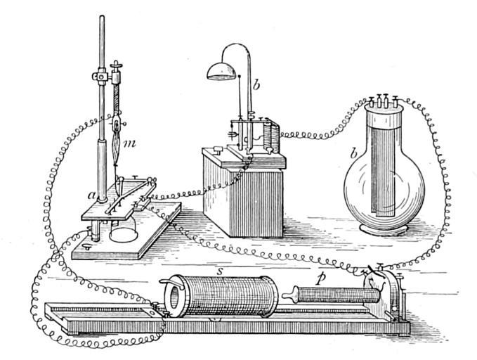 Keywords: Life in Motion Fig 11.png en Fig 11 ”Arrangement of apparatus for showing muscle lifting a weight b galvanic element; b in middle electric bell; p primary and s secondary coil of induction machine; a frog interrupter; m muscle See next figure Life in Motion or Muscle and Nervehttps //archive org/details/b21929786 John Gray McKendrick 1892 1926 Life in Motion book Galvanism |