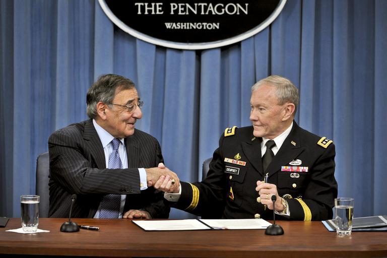 | Keywords: Lifting the Ban 2.jpg en Defense Secretary Leon E Panetta and Army Gen Martin E Dempsey chairman of the Joint Chiefs of Staff shake hands after signing a memo to lift the ban on women from serving in military combat roles as they address reporters at the Pentagon Jan 24 2013 2013-01-24 13 51 36 http //defense gov U S Department of Defense PD-USGov Uploaded with UploadWizard Leon Panetta in 2013 Martin E Dempsey Handshakes involving the military | ||||