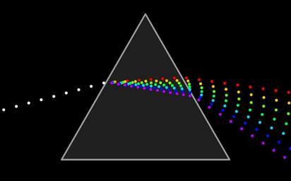 Keywords: Light dispersion conceptual.gif Waves thumb right A version with waves is now available Kieff Kieff<sub>Wikipedia</sub> Talk 04 12 24 December 2007 UTC Do not use the version with waves until it is fixed That image shows the red waves propagating faster outside the prism --Srleffler 00 05 17 February 2008 UTC This is now fixed 189 15 89 5 12 49 27 February 2008 UTC Note A new and more accurate version of this image is currently on the way Please be patient I've been busy lately and coding a version with waves is trickier than little balls Kieff Kieff<sub>Wikipedia</sub> Talk 01 48 23 February 2007 UTC dispersion of light as it travels through a triangular prism In vacuum shown in black light of any wavelength will travel at a fixed speed c But light slows down in a different medium such as glass or water and light of shorter wavelengths like <span style font-weight bold; color 9900FF; >indigo</span> will tend to travel slower than light of longer wavelengths like <span style font-weight bold; color FF0000; >red</span> This model attempts to convey this fact and its consequences by idealizing light as small particles travelling in space Of course light is not made of small particles but of electromagnetic waves so keep in mind this conceptual aspect of the image to avoid any misconceptions about the nature of light itself For our purposes however the model will suffice White light represented here by white dots is actually made out of light of several frequencies colors travelling together These basic frequencies of visible light are part of what we call visible spectrum and it is only tiny part of the entire electromagnetic spectrum As white light enters a medium in this case the prism each of its composing wavelengths will travel at a different speed in the new medium and this change in speed is what bends the path in which light is travelling This is the phenomenon we call refraction The ratio between the speed of light in vacuum and the speed of light in a medium is what we call index of refraction and this value is specific for a given wavelength and medium Since light of different wavelengths will change direction by a different amount we will experience a division of white light in its composing spectral colors represented here by colored dots This is what we call dispersion Once the basic frequencies are separated in this animation we can easily see the difference on their speeds Red with a long wavelength passes through almost without any change whereas indigo with short wavelength is left behind by all the other colors However this difference in speed does not hold in vacuum and this can be seen on how all light exiting the prism will once again travel at the constant speed of light in vacuum This is all just an easy way of seeing it so it is important to stress once again the fact that this model is not entirely accurate as light is not made of little round particles and white light can't exist on its own as can be misunderstood from the big white dots ---- Animation der Lichtbrechung in einem Prisma Dispersion in prisms Animations of physics Vacuum diagrams Triangular diagrams |
