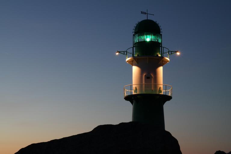 Keywords: lighthouse evening mood romantic water harbour entrance tower beacon illuminated night night photograph