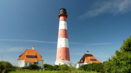 Keywords: lighthouse westerhever north sea nordfriesland intertidal zone coast signal mecklenburg tower wadden sea national park building salt meadow striped