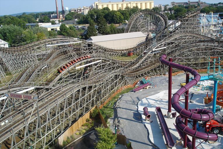 | Keywords: Lightning Racer at Hersheypark outtrack.jpg Lightning Racer at Hersheypark Hershey PA US View of the out turn-around portion of track furthest from the station Taken from the ferris wheel The two trains are seen in the helix portion in the center In the lower right is part of the partially constructed water attraction for the 2008 season The Hershey chocolate factory smoke stacks and cocoa bean storage silos are seen in the background Image was cropped Own 2006-08-17 Deron Meranda I release this photograph to the Public Domain Lightning Racer |