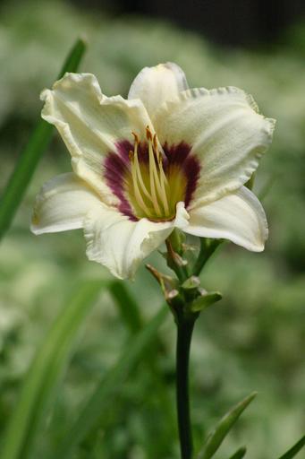 Keywords: lily daylily cream flower blooms garden anther petal stigma style filament burgundy purple