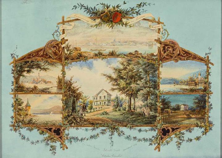 Keywords: Lindau Villa Schnell-Griot 1876.jpg deZur Erinnerung an Lindau August 1876 Der lieben Familie Schnell-Griot gewidmet von Wilhelm Dünckel Souvenirblatt mit sechs Lindauer Ansichten im Mittelgrund die Villa der Familie Schnell-Griot heute Bregenzer Straße 1 auf dem Grundstück des Marienheimes Aquarell Blatt 25 x 35 cm http //www zeller de/ Auktionshaus Zeller 1876 Wilhelm Dünckel PD-old-70-1923 Images from Auktionshaus Zeller History of Lindau Bodensee 1876 in Bavaria |