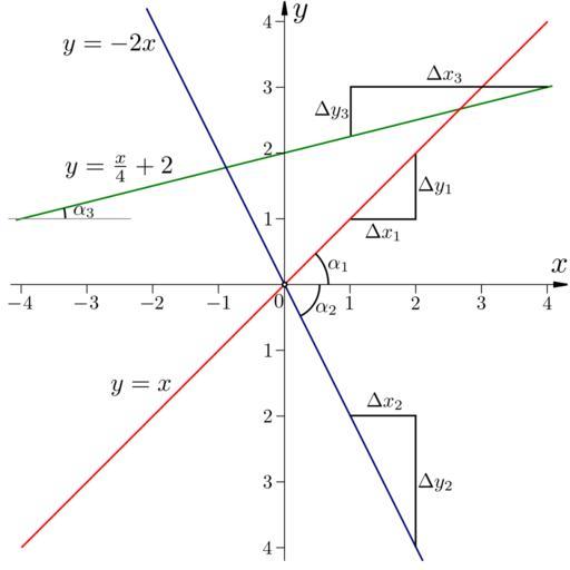 Keywords: Lines with Gradients.svg A graph showing the following lines y x red y -2x blue y x/4+2 green Also shown are the angles the lines make with the positive x-axis and the run and rise of each line x and y Self-made Inkscape 2007-10-23 Inductiveload Linear functions Slopes math |