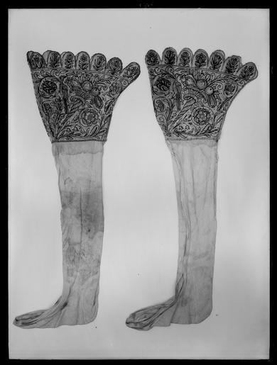 Keywords: Linnestrumpa, strövling - Livrustkammaren - 60069.tif Strumpa av tuskaftat linne trådtäthet 37x37 per cm2 Tillskuren i fyra delar två kragstycken ben och fot som är hopsydda med efterstygn Kragens övre kant avslutas med 14 flikar formade som bågar Formen påminner om reticella-spetsens bågformade kanter Den är fodrad med ett grövre linne som skyddar broderiets baksida Kragens höjd är 28 cm och dess övre omkrets 68 cm Broderade i svart silke och guldtråd huvudsakligen i stjälkstygn Motivet är lika på kragens båda sidor Huvudmotivet är ett ymnighetshorn med frukter som äpple päron och druvor Vid sidan av hornet en fågel Den återstående ytan täcks av slingrande blad och stjälkar samt blommor som tulpan ros och liljekonvalj På varje flik på kragen är en liten blomma broderad Motiven är dekorerade med guldtrådar lan på silkekärna som sytts i flätmönster Över sömmarna och kring den övre kanten ligger ett slätt guldband Broderiet överensstämmer med den engelska typen av broderi med svart tråd som man kan se på linneplagg från sent 1500-tal och tidigt 1600-tal Strumpans ben respektive fot är skurna på snedden för att ge bättre elasticitet och passform Benstycket har en liten triangulär skarvbit placerad vid mittbaksömmen uppe vid kragen Foten är skarvad framme vid tån Stockings or w Boothose en of linen 37x37 thread count per square cm Cut into four parts two cuffs legs and feet which are sewn with backstitch The upper edge of the cuff ends with 14 arch-shaped tabs The shape of the tabs is reminiscent of reticella needlelace -edgings The cuff is lined with a coarse linen that protects the back of the embroidery The cuff height is 28 cm and its upper circumference is 68 cm The cuffs are embroidered in black silk and gold wire primarily in stem stitch The motif is the same on both sides of the collar The main subject is a cornucopia with fruits incluidng apples pears and grapes At the side of the horn is a bird The remaining area is covered by meandering leaves and stems and flowers such as tulips roses and lily of the valley Each tab on the collar has a small embroidered flower The motifs are decorated with gold threads gold-wrapped silk core sewn in a cable pattern Over the seams and around the top edge is a plain gold band The embroidery is consistent with the English type of embroidery with black thread blackwork that can be seen on the linen garments from the late 1500s and early 1600s The sock and foot pieces are cut on the bias to provide better elasticity and fit The leg pice has a small triangular gusset from the middle of the back seam up to the cuff The foot is seamed in front of the toe original caption linnestrumpa strövling - LRK 31124 Slaget vid Lützen 1632 size mm 630 häl-krage size mm 280 krage size mm 320 fot g 116 LRK Gustav II Adolf av Sverige Modelejon 2002 Jubileumsutst Lützen-Kapelle 2007 2007 place of origin original filename LN_A01457_001457 67690 inventory number LRK 31124 60069 CC0 Linnestrumpa strövling - Livrustkammaren - 60069-negative tif <gallery caption Different images of same object > File Linnestrumpa strövling - Livrustkammaren - 68631 tif File Linnestrumpa - Livrustkammaren - 25703 tif File Linnestrumpa buren av Gustav II Adolf i slaget vid Lützen - Livrustkammaren - 35185 tif File Linnestrumpa strövling - Livrustkammaren - 77191 tif File Linnestrumpa strövling - Livrustkammaren - 8705 tif File Linnestrumpa buren av Gustav II Adolf i slaget vid Lützen - Livrustkammaren - 43744 tif File Linnestrumpa strövling - Livrustkammaren - 146 tif File Linnestrumpa strövling - Livrustkammaren - 147 tif File Linnestrumpa buren av Gustav II Adolf i slaget vid Lützen - Livrustkammaren - 52304 tif File Linnestrumpa strövling - Livrustkammaren - 77190 tif File Linnestrumpa buren av Gustav II Adolf i slaget vid Lützen - Livrustkammaren - 26624 tif File Linnestrumpa strövling - Livrustkammaren - 17267 tif </gallery> < 1620s fashion Stockings Linen clothing Blackwork embroidery 1630s fashion Embroidered clothing Media contributed by LSH dim-with multiple size templates Media contributed by LSH unmatched objKeyword Stockings in Livrustkammaren Images from Livrustkammaren Media contributed by LSH 2013-10 |