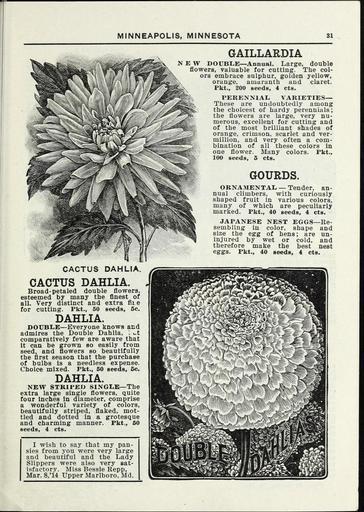 | Keywords: Lippincott seeds (15753197503).jpg MINNEAPOLIS MINNESOTA <br> SI <br> GAILLARDIA <br> N E W DOUBLE Annual Large double <br> flowers valuable for cutting The col- <br> ors embrace sulphur golden yellow <br> orange amaranth and claret <br> Pkt 200 Beeds 4 cts <br> PERENNlAIi VARIETIES <br> These are undoubtedly among <br> the choicest of hardy perennials ; <br> the flowers are large very nu- <br> merous excellent for cutting and <br> of the most brilliant shades of <br> orange crimson scarlet and Ver- <br> million and very often a com- <br> bination of all these colors in <br> one flower Many colors Pkt <br> 100 seeds 5 cts <br> GOURDS <br> ORNAMENTAL Tender an- <br> nual climbers with curiously <br> shaped fruit in various colors <br> many of which are peculiarly <br> marked Pkt 40 seeds 4 cts <br> JAPANESE NEST EGGS Re- <br> sembling in color shape and <br> size the egg of hens; are un- <br> injured by wet or cold and <br> therefore make the best nest <br> eggs Pkt 40 seeds 4 cts <br> CACTUS DAHLIA <br> CACTUS DAHLIA <br> Broad- petaled double flowers <br> esteemed by many the finest of <br> all Very distinct and extra fiLe <br> for cutting Pkt 50 seeds 5c <br> DAHLIA <br> DOUBLE Everyone knows and <br> admires the Double Dahlia 1 t <br> comparatively few are aware that <br> It can be grown so easily from <br> seed and flowers so beautifully <br> the first season that the purchase <br> of bulbs is a needless expense <br> Choice mixed Pkt 50 seeds 5c <br> DAHLIA <br> NEW STRIPED SINGLE The <br> extra large single flowers quite <br> four Inches in diameter comprise <br> a wonderful variety of colors <br> beautifully striped flaked mot- <br> tled and dotted in a grotesque <br> and charming manner Pkt 60 <br> seeds 4 cts <br> I wish to say that my pan- <br> sies from you were very large <br> and beautiful and the Lady <br> Slippers were also very sat- <br> isfactory Miss Bessie Repp <br> Mar 8 '14 Upper Marlboro Md 42162024 132824 65968 Page 31 Text http //www biodiversitylibrary org/page/42162024 1915 Henry G Gilbert Nursery and Seed Trade Catalog Collection ; Miss C H Lippincott Firm NameFound Gaillardia NameConfirmed Gaillardia Foug EOLID 38325 Biodiversity Heritage Library Lippincott seeds 1915 Garden Stories Catalogs Flowers Fruit Nurseries Horticulture Seeds Vegetables U S Department of Agriculture National Agricultural Library bhl page 42162024 dc identifier http //biodiversitylibrary org/page/42162024 bhlGardenStories BHLinbloom nurseries horticulture u s department of agriculture national agricultural library bhlgardenstories bhlinbloom Information field Flickr posted date ISOdate 2015-01-26 Check categories 2015 August 25 CC-BY-2 0 BioDivLibrary https //flickr com/photos/61021753 N02/15753197503 2015-08-25 05 55 44 cc-by-2 0 PD-old-70-1923 Lippincott seeds Photos uploaded from Flickr by FĂŚ using a script |