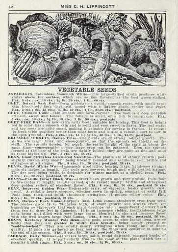 | Keywords: Lippincott seeds (15753447573).jpg 42 <br> MISS C H LIPPINCOTT <br> VEGETABLE SEEDS <br> ASPARAGUS Columbian Mammoth AVhite Thi s larg-e-stalked strain produces white <br> stalks above the surface which are as fine flavored as the best green-stalked <br> Pkt 5 cts ; oz 10 cts ; lb 20 cts ; 1 lb 60 cts <br> BEET Detroit Dark Ked Form globular or ovoid smooth roots with small tops <br> skin blood-red; flesh dark red zoned with a lighter shade tender and sweet <br> Pkt 5 cts ; oz 15 cts ; 4 lb 40 cts ; 1 lb ยง1 25 cts ; postpaid <br> BEET Crimson Globe Skin smooth and form regular The flesh is a deep purplish <br> crimson sweet and tender The foliage is small of a rich bronze-purple Pkt <br> 5 cts oz 10 cts ; lb 30 cts ; 1 lb 90 cts ; postpaid <br> BEET FIRE BALL A new extra early beet suitable for forcing This beet is bright <br> red in color has a smooth skin and is solid and very sweet in flavor The leaf stalks <br> and tap roots are quite small making it valuable for sowing in frames It i-etains <br> its fresh table qualities better than most beets and is also a valuable sort to sow in <br> the open ground Pkt 5 cts ; oz 15 c ; lb 40 cts ; 1 lb SI 25; postpaid <br> BRUSSELS SPROUTS Danish Prize The plants are of strong robust growth The <br> stalks are large thick and close-jointed so that the sprouts set thickly on the <br> stalk The sprouts develop for nearly the entire height of the stalk at about the <br> same time consequently a very large crop can be gathered Even the sprouts <br> formed at the base of the stalk are tightly folded ; they are quite as fine and solid <br> as those higher up Pkt 5 cts ; oz 35 cts <br> BEAN Giant Stringless Green-Pod Valentine The plants are of strong growth pods <br> slightly curved very meaty being broadly rounded and saddle-backed; brittle and <br> stringless at all stages Pkt 8 cts ; lb 20 cts ; postpaid 28 cts <br> BEAXS Davis' White Wax Immensely productive bearing large handsome straight <br> pods six inches in length The pods are however tough and with decided strings <br> The dry seed being white is desirable for winter market as a shelled bean Pkt <br> 8 cts ; lb 20 cts ; postpaid 28 cts <br> BEANS Prolific Dwarf Black Wax Dwarf bush grown and very prolific Pods four <br> to five inches in length usually curved quite round; meaty brittle and stringless <br> deep golden yellow of excellent flavor Pkt 8 cts ; lb 20 cts postpaid 28 cts <br> BEAN Improved Golden Wax Moderately early of vigorous bushy growth rust- <br> proof A reliable heavy cropper whether sown in spring summer or early fall <br> Pods long thick and solid absolutely stringless of golden yellow color Pkt <br> 8 cts ; lb 20 cts postpaid 28 cts <br> BEAN Burpee's Bush Lima Burpee's Bush Lima comes absolutely true from seed <br> The bushes grow IS to 20 inches high of stout growth and always erect yet <br> branching so vigorously that each plant develops into a magnificent circular bush <br> from two to three feet in diameter It is an immense yielder the handsome large <br> pods being well filled with very large beans identical in size and luscious flavor <br> with the well known large Pole Limas Pkt 8 cts ; lb 20 cts postpaid 28 cts <br> BEANS Kentucky Wonder Pole Bean The pods seven to nine inches long are ยซ o <br> fleshy that they are greater in width than breadth being deeply creased or <br> saddle-backed They are solidly meaty stringless when young and of finest <br> quality If pods are gathered as they mature the vines will continue to bear t ยป <br> the end of the season Pkt 8 cts ; lb 20 cts postpaid 28 cts <br> C \BBAGE Early Summer It makes large solid round flattened compact heads of <br> excellent quality It is particularly true in the color of the plant which has i <br> peculiar bluish tinge Pkt 5 cts ; oz 20 cts ; V lb 65 cts 42205450 132981 65968 Page 42 Text http //www biodiversitylibrary org/page/42205450 1915 Henry G Gilbert Nursery and Seed Trade Catalog Collection ; Miss C H Lippincott Firm NameFound Asparagus NameConfirmed Asparagus var pygmaeus Makino EOLID 10487111 NameFound Limas NameConfirmed Limas NameBankID 4220815 Biodiversity Heritage Library Lippincott seeds 1916 Garden Stories Catalogs Flowers Fruit Nurseries Horticulture Seeds Vegetables U S Department of Agriculture National Agricultural Library bhl page 42205450 dc identifier http //biodiversitylibrary org/page/42205450 bhlGardenStories BHLinbloom nurseries horticulture u s department of agriculture national agricultural library bhlgardenstories bhlinbloom Information field Flickr posted date ISOdate 2015-01-26 Check categories 2015 August 25 CC-BY-2 0 BioDivLibrary https //flickr com/photos/61021753 N02/15753447573 2015-08-25 05 51 20 cc-by-2 0 PD-old-70-1923 Lippincott seeds Photos uploaded from Flickr by Fรฆ using a script |