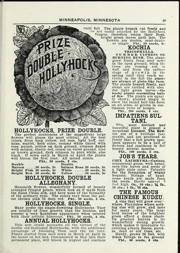 | Keywords: Lippincott seeds (16185558518).jpg MINNEAPOLIS MINNESOTA <br> HOLLYEOCKS PRIZE DOUBLE <br> The perfect doubleness of the magnificent large <br> flowers will please the most critical All the best <br> colors from deep yellow red rose light buff car- <br> mine scarlet flesh color creamy white tinted with <br> rose purple yellow on dark ground crimson flaked <br> with salmon cherry red cream on violet ground lilac <br> on brown ground dark crimson to pure white also <br> black If sown early in March or April the plants <br> will bloom the first year All mixed colors <br> Pkt 50 seeds 5 cts <br> Double Double <br> Maroon 50 seeds 5c Salmon Rose 50 seeds 5c <br> Bright Pink 50 seeds 5c Wliite 50 seeds 5c <br> Bright Red 50 seeds 5c Yellow 50 seeds 5c <br> HOLLYHOCKS DOUBLE <br> ALLEGHANY <br> Mammoth flowers wonderfully formed of loosely <br> arranged fringed petals which look as if made from <br> the finest China silk and have none of the formality <br> of the ordinary type The colors vary from the pal- <br> est shrimp pink to deep red Pkt 50 seeds 5 cts <br> HOLLYHOCKS SINGLE <br> Many prefer the single-flowering Hollyhocks They <br> are usually of freer growth than the doubles and <br> present a very handsome appearance when covered <br> with their artistic blossoms Pkt 50 seeds 4 cts <br> ANNUAL HOLLYHOCKS <br> This new strain possesses all the virtues of the <br> double old-fashioned Hollyhocks with the additional <br> advantage of blooming from seed the rst year <br> Plants started from seed sown in March or April in <br> the house or hot bed transplanted in May into their <br> permanent place will bloom in August and continue <br> until fall The plants branch nut freely and <br> re not easily attacked by the Hollyhock <br> fungus therefore retain their fresh <br> bright green leaves until late The <br> flowers are double semi-doubl- <br> or single Pkt 50 seeds 4c <br> KOCHIA <br> TRICOPHYLLA <br> SUM31ER CYPRESS OR <br> BURNING BUSH The plant <br> grow freely from seed sown <br> in the open ground when tli <br> trees are coming out in <br> leaf and from the earliesi <br> stage of growth in the <br> spring until they reach m;i <br> turity in the fall the plant <br> are always of globe-like form <br> The plants branch freely and <br> stems are clothed with slen <br> der light green leaves ” tht- <br> bushy plants resembling ball»s <br> of fire The plants are equal <br> ly showy planted singly to <br> show the round ball- like form <br> on all sides or grown in con- <br> tinuous rows or hedges <br> Pkt 200 seeds 4 cts <br> IMPATIENS SUL- <br> TANI <br> This most distinct and <br> beautiful plant is almost a <br> perpetual bloomer The flow- <br> ers are of a brilliant rosy <br> scarlet and are produced so <br> freely that a full grown spec- <br> imen appears to be a ball of <br> flowers and continues in full <br> beauty several months <br> Pkt 100 seeds 5 cts <br> JOB S TEARS <br> COIX LACHRYMA ” Curious <br> ornamental grass with broad <br> corn-like leaves and seeds of <br> a light slate color Valuable <br> for the formation of winter <br> boquets Strings of hand- <br> some beads are made from <br> the seeds Hardy annual 8 <br> feet high Oz 10 cts ; lb <br> 25 cts ; 1 lb 75 cts <br> THE FAMOUS <br> CHINESE KUDZU <br> A vine that will grow everr- <br> where Flourishes where noth- <br> ing else will grow and lasts <br> for many years The large <br> bold leaves of the brightest <br> green afford a dense shade <br> Its greatest feature is its <br> wonderfully strong growth <br> which makes it invaluable foi <br> covering arbors fences porch <br> es dead or old trees etc <br> Hardy grows 50 feet with <br> dense foliage to the ground <br> Pkt 40 seeds 6 cts 42162005 132824 65968 Page 35 Text http //www biodiversitylibrary org/page/42162005 1915 Henry G Gilbert Nursery and Seed Trade Catalog Collection ; Miss C H Lippincott Firm NameFound Coix lachryma NameConfirmed Coix lacryma L EOLID 5831251 NameBankID 8985074 NameFound Kochia NameConfirmed Kochia Roth EOLID 61798 Biodiversity Heritage Library Lippincott seeds 1915 Garden Stories Catalogs Flowers Fruit Nurseries Horticulture Seeds Vegetables U S Department of Agriculture National Agricultural Library bhl page 42162005 dc identifier http //biodiversitylibrary org/page/42162005 bhlGardenStories BHLinbloom nurseries horticulture u s department of agriculture national agricultural library bhlgardenstories bhlinbloom Information field Flickr posted date ISOdate 2015-01-26 Check categories 2015 August 25 CC-BY-2 0 BioDivLibrary https //flickr com/photos/61021753 N02/16185558518 2015-08-25 05 53 48 cc-by-2 0 PD-old-70-1923 Lippincott seeds Photos uploaded from Flickr by Fæ using a script |