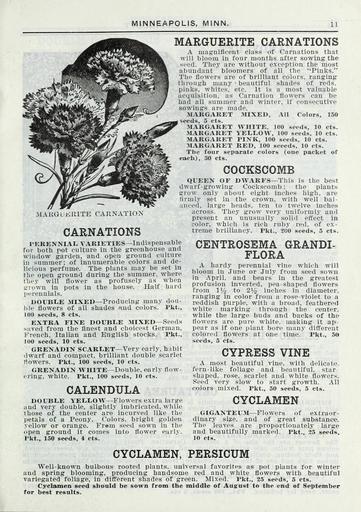| Keywords: Lippincott seeds (16185744948).jpg MINNEAPOLIS MINN <br> 11 <br> MAKaLi RITE CARNATION <br> CARNATIONS <br> MARGUERITE CARNATIONS <br> A magnificent class of Carnations ttiat <br> will bloom in four months after sowing the <br> seed Thej' are without exception the most <br> abundant bloomers of all the Pinks <br> The flowers are of brilliant colors ranging <br> through many beautiful shades of reds <br> pinks whites etc It is a most valuable <br> acquisition as Carnation flowers can be <br> had all summer and winter if consecutive <br> sowings are made <br> 3IAKGARET MIXED All Colors 150 <br> MARGARET WHITE 100 seeds 10 cts <br> MARGARET YELEOW 100 seeds 10 cts <br> MARGARET PINK 100 seeds 10 cts <br> 3IARGARET RED 100 seeeds 10 cts <br> The four separate colors one packet of <br> each 30 cts <br> COCKSCOMB <br> QUEEN OF DWARFS This is the best <br> dwarf-growing Cockscomb ; the plants <br> grow only about eight inches high are <br> firmly set in the crown with well bal- <br> anced large heads ten to twelve inches <br> across They grow very uniformly and <br> present an unusually solid effect in <br> color which is rich ruby red of ex- <br> treme brilliancy Pkt 200 seeds 5 cts <br> PERENNIAL VARIETIES Indispensable <br> for both pot culture in the greenhouse and <br> window garden and open ground culture <br> in summer; of innumerable colors and de- <br> licious perfume The plants may be set in <br> the open ground during the summer where <br> they will flower as profusely as when <br> trrown in pots in the house Half hard <br> perennials <br> DOUBEE MIXED Producing many dou- <br> ble flowers of all shades and colors Pkt <br> 100 seeds 8 cts <br> EXTRA FINE DOUBLE MIXED Seeds <br> saved from the finest and choicest German <br> French Italian and English stocks Pkt <br> 100 seeds 10 cts <br> GRENADIN SCARLET Very early habit <br> dwarf and compact brilliant double scarlet <br> flowers Pkt 100 seeds 10 cts <br> GRENADIN WHITE Double early flow- <br> ering white Pkt 100 seeds 10 cts <br> CALENDULA <br> DOUBLE YELLOW Flowers extra large <br> and very double slightly imbricated while <br> those of the center are incurved like the <br> l etals of a Peony Colors bright golden <br> yellow or orange Frem seed sown in the <br> open ground it comes into flower early <br> I'kt 150 seeds 4 cts <br> CENTROSEMA GRANDI- <br> FLORA <br> A hardy perennial vine which will <br> bloom in June or July from seed sown <br> in April and bears in the greatest <br> profusion inverted pea-shaped flowers <br> from 11/2 to 21/ inches in diameter <br> ranging in color from a rose-violet to a <br> reddish purple with a broad feathered <br> white marking through the center <br> while the large buds and backs of the <br> flowers are pure white making it ap- <br> pear as if one plant bore many different <br> colored flowers at one time Pkt 50 <br> seeds 5 cts <br> CYPRESS VINE <br> A most beautiful vine with delicate <br> fern-like foliage and beautiful star- <br> shaped rose scarlet and w hite flowers <br> Seed very slow to start growth All <br> colors mixed Pkt 50 seeds 5 cts <br> CYCLAMEN <br> GIGANTEUM Flowers of extraor- <br> dinary size and of great substance <br> The leaves are proportionately large <br> and beautifully marked Pkt r25 seeds <br> 10 cts <br> CYCLAMEN PERSICUM <br> Well-known bulbous rooted plants universal favorites as pot plants for winter <br> and spring blooming producing handsome red and white flowers with beautiful <br> variegated foliage in different shades of green Mixed Pkt 25 seeds 5 cts <br> Cyclamen seed should be sown from the middle of August to the end of September <br> for best results 42205419 132981 65968 Page 11 Text http //www biodiversitylibrary org/page/42205419 1915 Henry G Gilbert Nursery and Seed Trade Catalog Collection ; Miss C H Lippincott Firm NameFound Calendula NameConfirmed Calendula EOLID 59414 NameBankID 25725 NameFound Centrosema grandi NameFound Cyclamen giganteum Biodiversity Heritage Library Lippincott seeds 1916 Garden Stories Catalogs Flowers Fruit Nurseries Horticulture Seeds Vegetables U S Department of Agriculture National Agricultural Library bhl page 42205419 dc identifier http //biodiversitylibrary org/page/42205419 bhlGardenStories BHLinbloom nurseries horticulture u s department of agriculture national agricultural library bhlgardenstories bhlinbloom Information field Flickr posted date ISOdate 2015-01-26 Check categories 2015 August 25 CC-BY-2 0 BioDivLibrary https //flickr com/photos/61021753 N02/16185744948 2015-08-25 05 51 53 cc-by-2 0 PD-old-70-1923 Lippincott seeds Photos uploaded from Flickr by FĂŚ using a script |