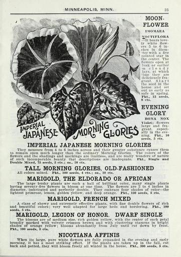 | Keywords: Lippincott seeds (16187190829).jpg s are inadequate Pkt Single and <br> Double Mixed 75 seeds 5 cts ; oz 20 cts <br> TALL MORNING GLORIES OLD-FASHIONED <br> All colors mixed Pkt 100 seeds 4 cts ; oz 10 cts <br> MARIGOLD THE ELDORADO OR AFRICAN <br> The large bushy plants are each a ball of brilliant color many single plants <br> having seventy-five flowers in bloom at one time The flowers are 3 to 4 inches In <br> diameter imbricated and perfectly double They embrace four shades of color ” the <br> lightest primrose lemon golden yellow and deep orange Pkt 100 seeds 5 cts <br> MARIGOLD FRENCH MIXED <br> A class of showy and extremely effective plants with fine double flowers of rich <br> and beautiful colors; very well adapted for large beds and bordering Pkt 100 <br> ' marigold legion of honor dwarf single <br> The blooms are of medium size rich golden yellow with the center of each petal <br> broadly marked with velvety crimson brown and with clustering stamens in bright <br> shades of orange yellow; blooms abundantly from July until cut down by frost <br> Pkt 100 seeds 5 cts <br> NICOTIANA AFFINIS <br> When its large pure white flowers are fully expanded in the evening and early <br> morning it has a most striking effect If the plants are taken up in the fall cut <br> back and potted they will bloom freely all winter in the house Pkt 300 seeds 5 cts 42205433 132981 65968 Page 25 Text http //www biodiversitylibrary org/page/42205433 1915 Henry G Gilbert Nursery and Seed Trade Catalog Collection ; Miss C H Lippincott Firm NameFound Bona nox NameFound Nicotiana affinis NameConfirmed Nicotiana affinis T Moore EOLID 486699 NameBankID 618477 Biodiversity Heritage Library Lippincott seeds 1916 Garden Stories Catalogs Flowers Fruit Nurseries Horticulture Seeds Vegetables U S Department of Agriculture National Agricultural Library bhl page 42205433 dc identifier http //biodiversitylibrary org/page/42205433 bhlGardenStories BHLinbloom nurseries horticulture u s department of agriculture national agricultural library bhlgardenstories bhlinbloom Information field Flickr posted date ISOdate 2015-01-26 Check categories 2015 August 25 CC-BY-2 0 BioDivLibrary https //flickr com/photos/61021753 N02/16187190829 2015-08-25 05 51 28 cc-by-2 0 PD-old-70-1923 Lippincott seeds Photos uploaded from Flickr by Fæ using a script |