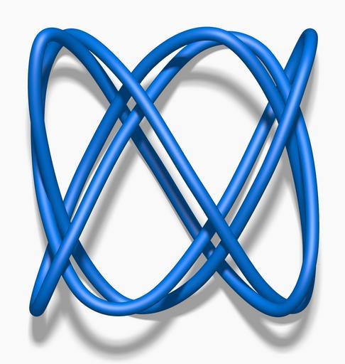Keywords: Lissajous Square Knot.png Created with Persistence of Vision en A Lissajous square knot own Jim belk 2010-03-26 Source This image was created using POV-Ray for Windows version 3 6 The image was rendered to an 1800 x 1800 square using 0 3 anti-aliasing and then cropped and compressed using pngcrush <pre> include colors inc background color White global_settings assumed_gamma 1 0 camera location <0 0 -25> right <1 0 0> up <0 1 0> look_at <0 0 0> angle 5 light_source <0 20 -50> color White area_light <5 0 0> <0 5 0> 10 10 / very slow decrease 10 to 2 for experiments / adaptive 3 declare r_tube 0 04; declare num_steps 36; declare step_size 1/num_steps; sphere_sweep cubic_spline num_steps+3 declare N -1; while N < num_steps + 1 declare theta 2 pi N step_size; < 0 8 cos 3 theta + 0 7 0 8 cos 5 theta + 1 + 0 075 0 3 cos 7 theta +0 06> r_tube declare N N + 1; end pigment color rgb <0 0 25 1> finish ambient 0 15 diffuse 0 85 brilliance 2 phong 0 25 phong_size 5 plane <0 0 -1> -0 4 pigment color White finish ambient 0 35 diffuse 0 65 </pre> Blue knots Square knots knot theory Knots and links on white background 3D Lissajous curves Images with Povray source code |