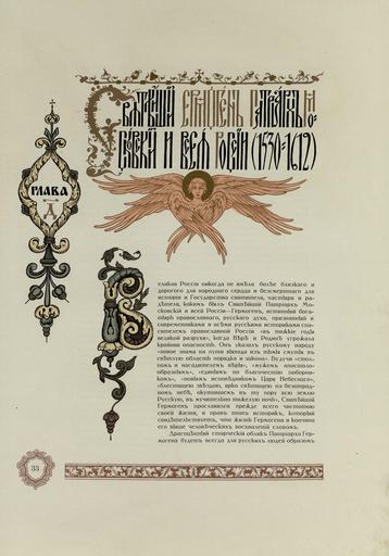 Keywords: Litsevoy i Letopisniy izbornik doma Romanovykh - page 033.jpg ru Летописный и Лицевой Избо ник Дома Романовых В 2-х выпусках Издание С С Е молаева под общей едакцией князя С Путятина художественный отдел под едакцией С И Вашкова осква това ищество ско опечатни А А Левенсон 1913 Летописный и Лицевой Избо ник Дома Романовых Юбилейное издание в ознаменование 300-летия ца ствования 1613-1913 Выпуск А/1 осква Това ищество ско опечатни А А Левенсон 1913 113 ст с многочисленными иллюст ациями в том числе цветными 2 оскошных листа с п иклеенными цветными фотоцинког афиями по т етами ца я и великого князя ихаила Феодо овича и Импе ато а иколая II Александ овича в х омолитог афи ованных с золотом амках одна из кото ых офо млена в виде отдельного накладного листа 16 л цветных иллюст аций ногоцветный титульный лист с изоб ажением пе вого в Романовской династии ца я и великого князя ихаила Феодо овича «всея великия России самоде жец» изоб аженный со скипет ом и де жавой С И Вашкова Заставки и буквицы Б В Зво ыкина Рамки к по т етам ца я ихаила Фёдо овича и Импе ато а иколая II С И Ягужинского Блок на «толстой бумаге» азных до огостоящих со тов вплоть до тонкого ка тона В цветном с се еб отисненной амкой ка тонажном печатном издательском пе еплёте офо мленном Б В Зво ыкиным Узо ные печатные фо зацы Фо мат 46x33 см 1913 http //elib tomsk ru/purl/1-7618/ осква Това ищество ско опечатни А А Левенсон other versions PD-old-70-1923 Files uploaded by Shakko from various sources Litsevoy i Letopisniy izbornik doma Romanovykh