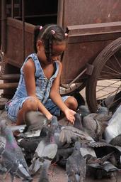 Keywords: little girl doves dear street kid feeding friends cute