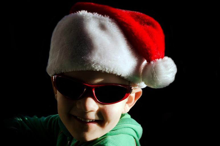 Keywords: little santa hat red glasses child people boy kid male portrait modern young smile tradition christmas xmas december family son grandson shadows background black holiday