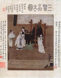 Keywords: Liu Songnian Testing Bell.jpg en Three Sages Appreciating Antique by Liu Songnian Polychrome on silk Southern Song Dynasty abt 1300 CE Private collection 2011-06-22 15 31 26 Photograph by contributor Liu Songnian PD-art-100 Check categories 2013 October 29 Liu_Songnian |
