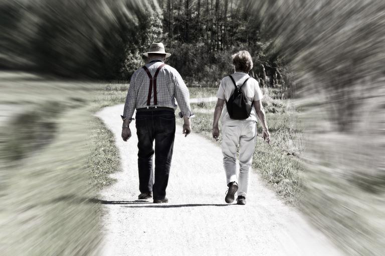Keywords: live age time movement human pair walk go hiking together trace romance nostalgia past transience old retro