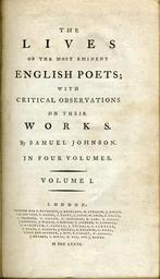 Keywords: LivesEnglishPoetsTP1781.jpg Title page of a 1781 edition of Samuel Johnson's Lives of the Poets Private Collection of S Whitehead 1781 Samuel Johnson C Bathurst Public Domain PD-old-100 Samuel Johnson Scientific books book covers single pages etc 1781 books Title pages from England |